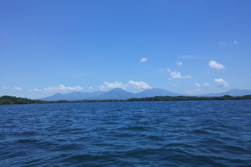 Jiquilisco Bay with Volcanoes in the background.